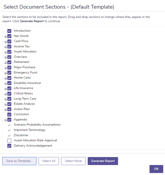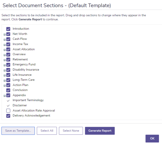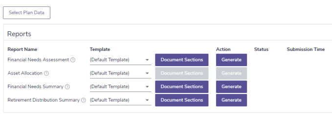 | Financial Needs Summary | This report provides an overview of your clients’ current financial situation with special emphasis on their retirement goal. Typically, this report is used when the recommended plan has been finalized as the final presentation to the clients. |