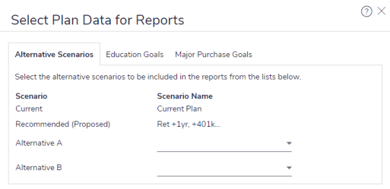 To include alternative plans in the Legacy reports, click Select Plan Data, and then select the alternative plans to include.